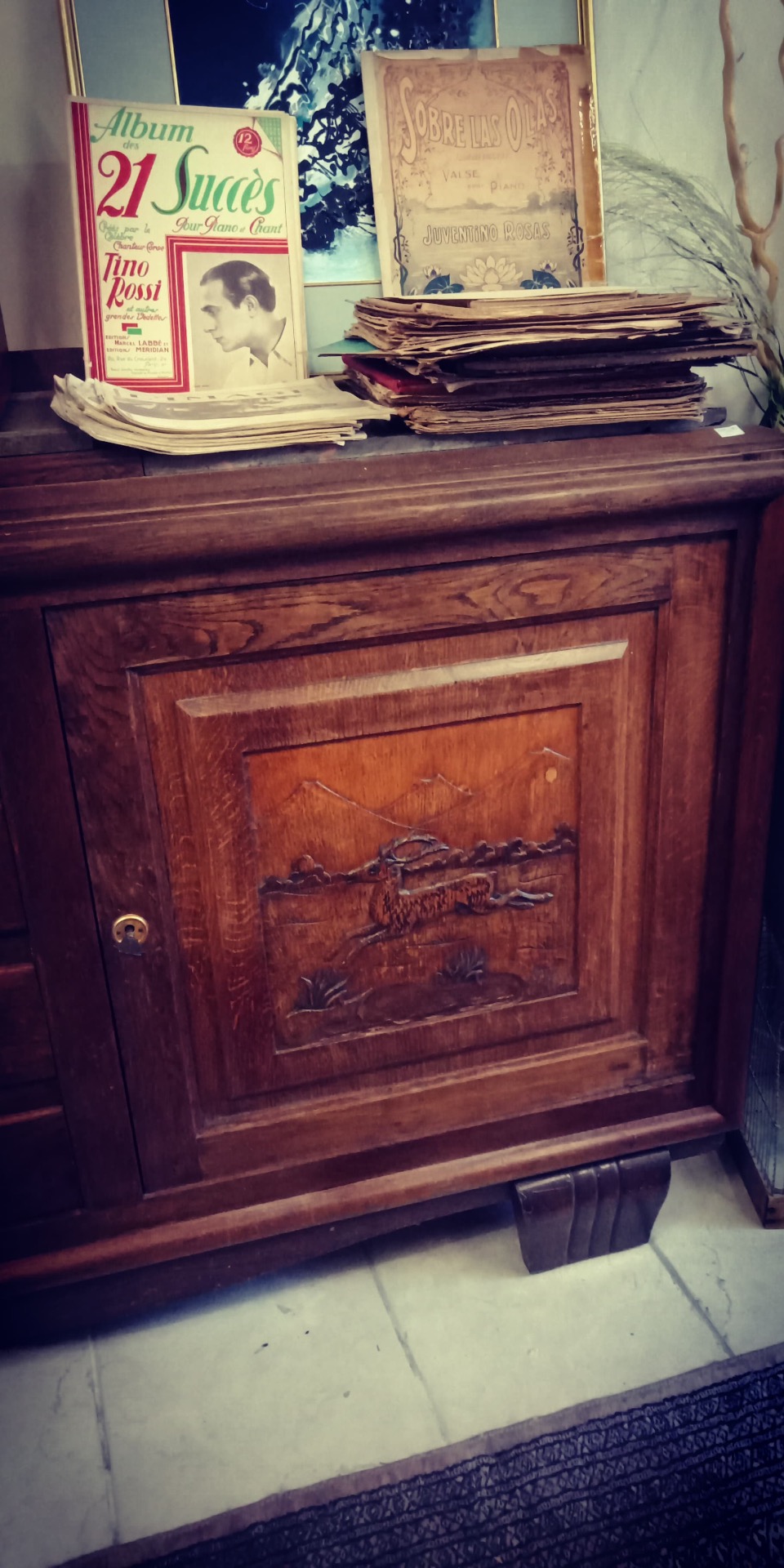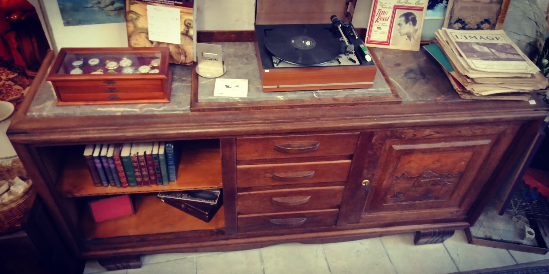 Buffet en noyer avec 3 plaques de marbre gris sur le dessus + deux portes latérales et milieu composé de deux tiroirs en bas et deux faux tiroirs en haut.